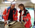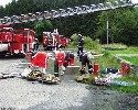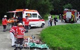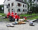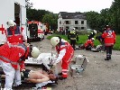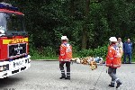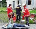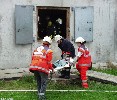 Fotos: ako Bericht aus dem Ahlener TageblattEs ist punkt 18 Uhr. Oberbrandmeister Guido Sellenrieck löst den Alarm aus. Er gibt bekannt, dass das neben ihm das Übungshaus der Bundeswehr im Oestricher Holt explodiert sei. "Gibt es Verletzte?" fragt die Stimme am anderen Ende des Funks. "Das ist sehr wahrscheinlich, vielleicht etwa neun", gibt der Feuerwehrmann über den Funkmeldeempfänger an. Seine Stimme ist ruhig und gelassen. So sollte es auch im wirklichen Notfall sein. Tatsächlich ist das Übungshaus nicht explodiert, denn am vergangenen Mittwoch Abend handelte es sich eine Alarmübung der freiwilligen Feuerwehr, Löschzug Süd. Schon vorher sind neun Kinder vom Jugendrotkreuz nach den Regeln der realistischen Unfalldarstellung (RUD) mit Kunstblut und erschreckend originalgetreu geschminkten Brandwunden zu "Verletzten" gemacht worden. Ihre Kleidung ist zerfetzt und verkohlt - als wäre das Haus tatsächlich explodiert. Auf Kommando des Brandmeisters gehen sie auf Position und sind von nun an bewusstlos, verwundet, verschüttet. Über Funk sind auch der Löschzug Hamm-Süd, sowie die Schnelleinsatzgruppe des Roten Kreuzes alarmiert worden, die schon zum zweiten mal bei einer Übung des Löschzuges Süd dabei ist. Die Minuten erscheinen wie Stunden, wie eine halbe Ewigkeit, bis man das Martinshorn von weitem hört. Doch die zwölf Minuten, die die Feuerwehrmänner brauchen, sind für die Entfernung vom Vatheuershof, dem Standpunkt des Löschzuges, eine gute Leistung. Der Einsatz beginnt schon bevor die roten Löschfahrzeuge den eigentlichen Unglücksort erreicht haben. Eine Wasserquelle muss aufgetan werden, da der nächste Hydrant nicht nur zwei Kilometer entfernt ist, sondern auch nicht genug Wasser zur Verfügung stellen würde. Also werden die Schläuche an einem offenen Gewässer angebracht, in diesem Fall an einem unscheinbar schwarzen Wasserbecken. An der Unfallstelle ist Schnelligkeit, Koordination und Kooperation gefragt, nur eines nicht: Panik. Ein verzweifelter Vater, der seine Kinder aus dem Haus befreien will, muss beruhigt und von der Brandstelle geführt werden. Eine Handlung, die neben der Menschenrettung, Brandbekämpfung und Wasserversorgung geschehen muss. Das Rote Kreuz richtet zeitgleich eine Verletzensammelstelle ein. Bevor die Notfallpritschen aufgebaut sind muss Erstversorgung geleistet werden: Stabile Seitenlage, Puls messen, Beatmung. Nur in den wenigsten Fällen reichen warme Decke und beruhigendes Zureden. Wehrführer Heinz-Werner Teckentrup ist zufrieden. Die Kooperation mit dem Hammer Löschzug und dem Roten Kreuz funktioniert gut, ein wichtiges Ziel dieser Alarmübung. Am Ende stellt er fest: "Überwiegend lief alles, wie es laufen muss". Der Löschzug ist auf solche Einsätze gut vorbereitet. Trotz der guten Bewältigung hört man Aufatmen der Erleichterung, als die Kinder nach dem vermeintlichen Unglück wieder quicklebendig aufspringen und die schweren Brandwunden abschminken können. Gut zu wissen, dass dies eine Übung war. |